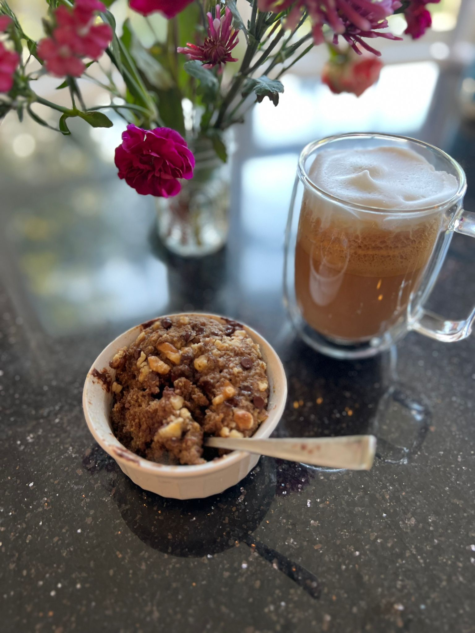 Mix up the following:1 egg1 tsp olive oil1 tsp vanilla1/4 cup Flaxseed Ground 1/2 tsp baking powder1/4 tsp ground cinnamon 1 Tbsp SugarWalnuts & chocolate chips put in ramekin & microwave 1 min 30 seconds.